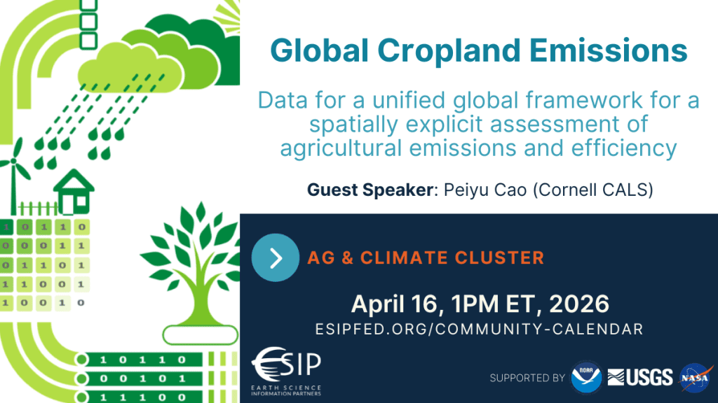 This Cluster aims to build strong collaborations with agriculture and climate communities, particularly those focused on climate change impacts, while gaining a deep understanding of their needs and seeking expertise in the broader ESIP community to co-develop and integrate effective data systems and solutions.